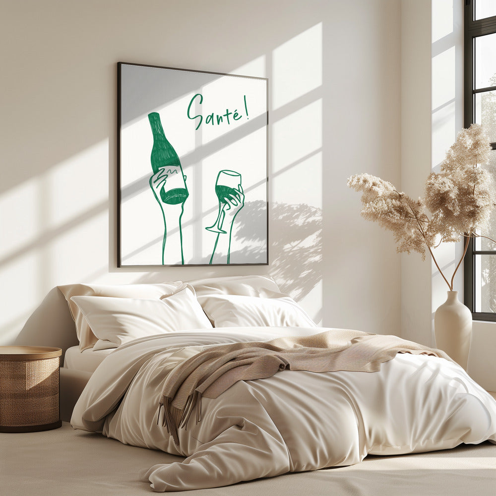 Hands holding a wine bottle and a wine glass with the text "Cheers!" in French | PosterSKU:2873173-5